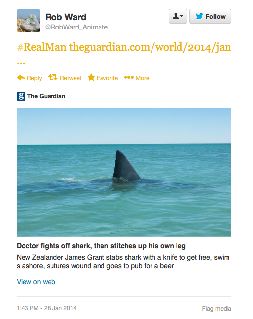 James Grant has set the bar high for those who aspire to be ‘real men’. He’s a New Zealand doctor who was attacked by a shark while spearfishing with friends. He stabbed the shark with a knife that he had in his hand, climbed onto some nearby rocks and took off his wetsuit to find he had 5cm bites on his leg. He stitched up his own wounds using a first aid kit he kept in his vehicle for his other hobby of pig-hunting. And he then went to the pub for a beer with his mates until he was told to go to hospital because he was dripping blood on the floor. It’s a great story that plays into all our stereotypes of men being tough, fierce, impervious to pain, self-sufficient and unafraid. Inevitably social media exploded with references to him being a #realman like that above. But is this really the behaviour that we should expect from half the world’s population?