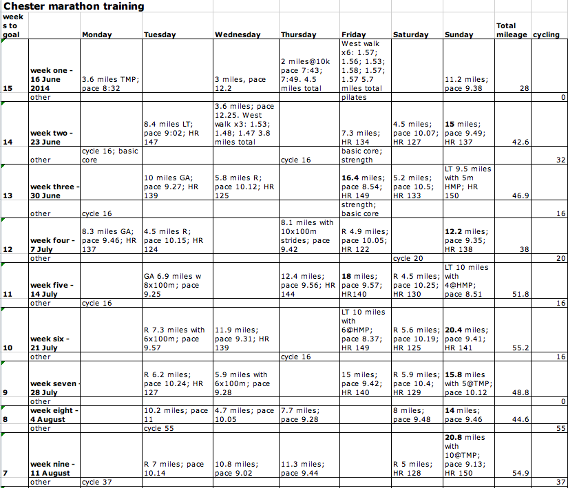 My goal for the Chester marathon last year was to go sub 3:50; it was my last chance to get a good-for-age rating in my 40s. It was a pretty challenging target, so I tried a new training plan – the lowest mileage one in Pftzinger and Douglas’ Advanced Marathoning book. The word ‘Advanced’ appealed to my vanity, but it’s also an interesting plan and higher mileage than I’d doneΒ before. P&D is an 18-week plan which has four cycles – to build endurance, increase lactate threshold, prepare for the race and then taper. There are hard weeks when you build your mileage and push yourself in speedwork, and then easy weeks when you let your body acclimatise to the training you’ve done so far. In the end, I twisted my ankle three weeks before the race so lost momentum and came in at 3:50:14. (I’m still annoyed about those 14 seconds.) But the 18-week plan served me well.