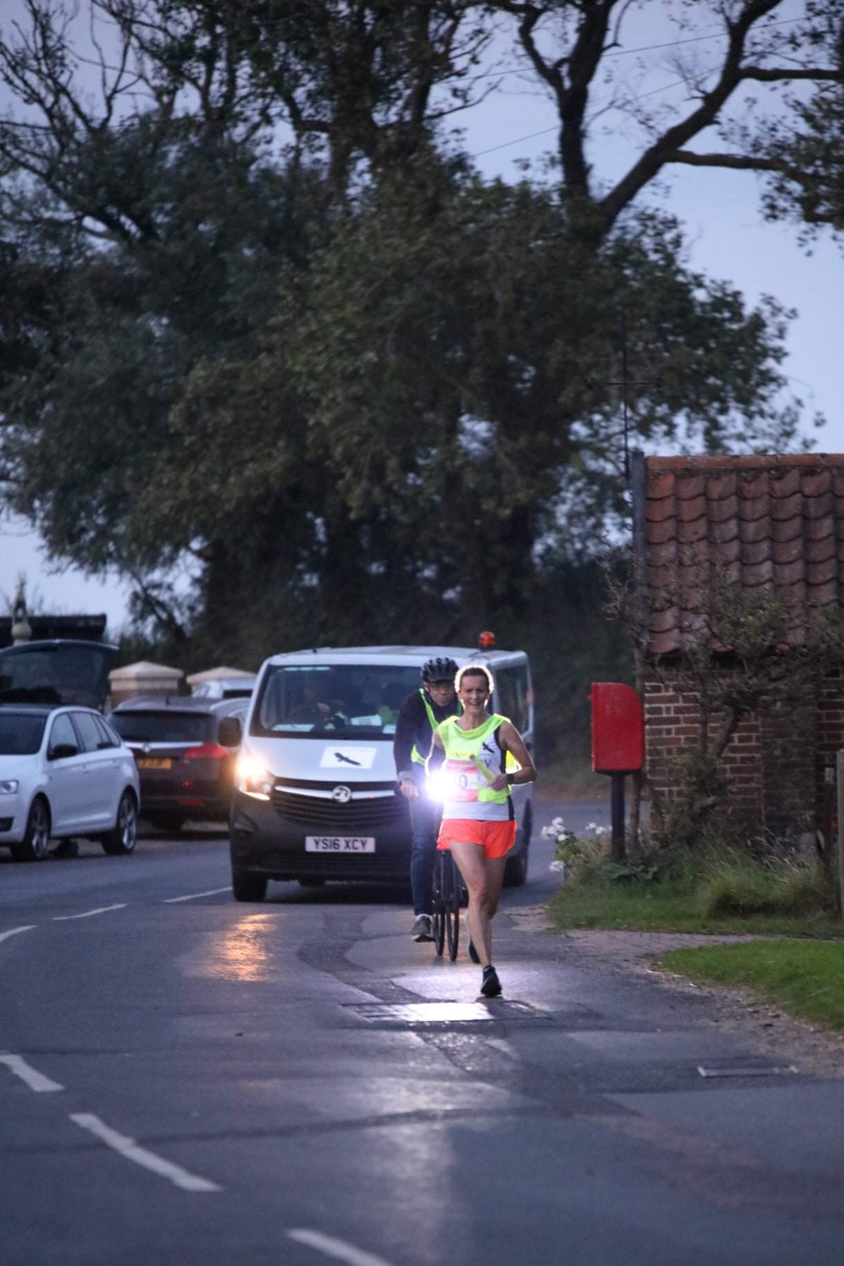 I was then cycle support for Jon’s stage around midnight – 12 miles from Earsham to Scole along a main road. Jon was like a metronome, steadily overtaking seven teams in total. I need to practice manoeuvring water bottles while cycling, but I just about managed to hand him water when he needed it without crashing into him.
