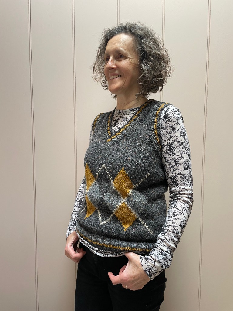 - a Vogue sweater vest for me – see awkward photo above. I decided to knit this in the round before realising that doesn’t really work for intarsia patterns. Duplicate stitching the diagonals was a new skill for me.